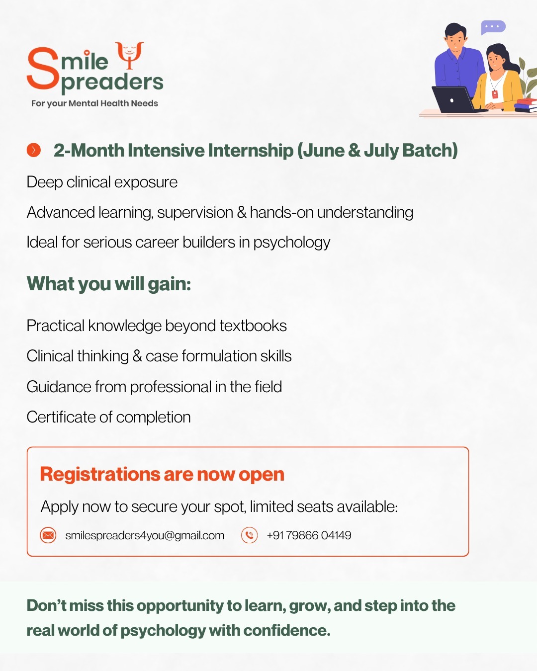 We are more than grateful in assisting students in the field of Psychology in providing practical skills-based trainings, internships, workshops, case discussions for their own upgradation in order to contribute meaningfully in the field of mental health.